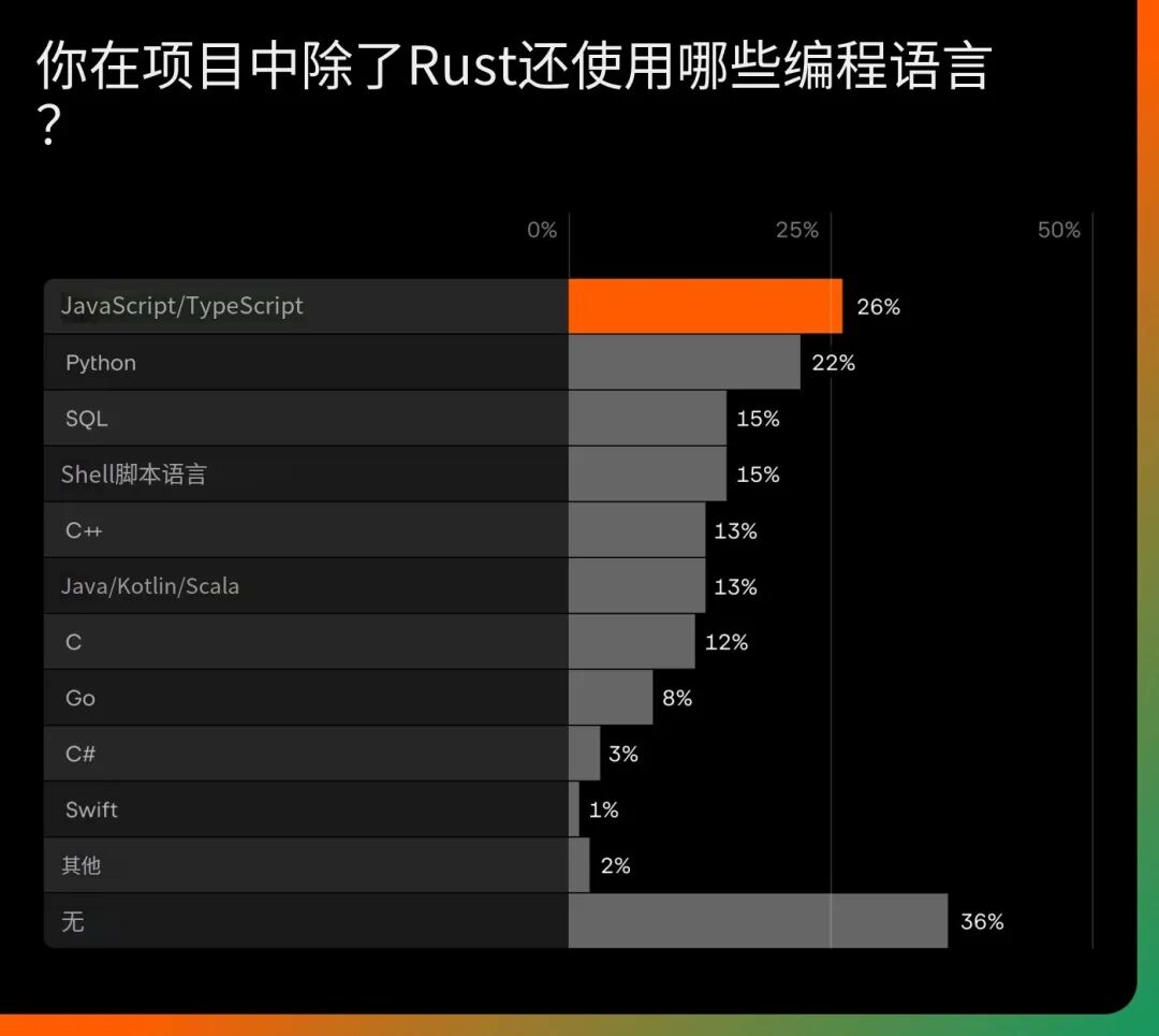 Rust最常与其他编程语言一起使用,而非孤立存在。JavaScript 和 TypeScript位居榜首,其次是 Python、SQL 和 Shell 脚本语言。这反映了 Rust 如何被集成到现有技术栈中:在为性能关键的组件提供动力的同时,与更高级的语言并肩工作。