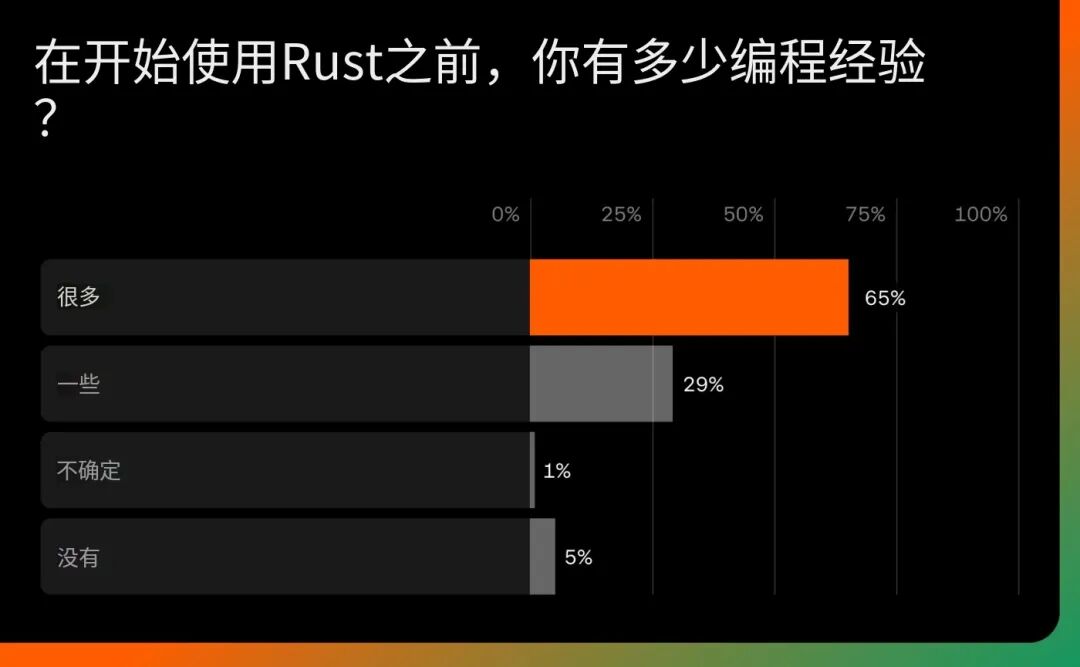 大多数 Rust 用户在开始学习之前就已经具备编程经验。这意味着 Rust 的采用主要是由那些使用过其他语言和系统的开发者推动的,他们有意识地选择探索 Rust。这些人不是把 Rust 作为第一门语言的初学者,而是寻求更好工具的专业人士和爱好者。