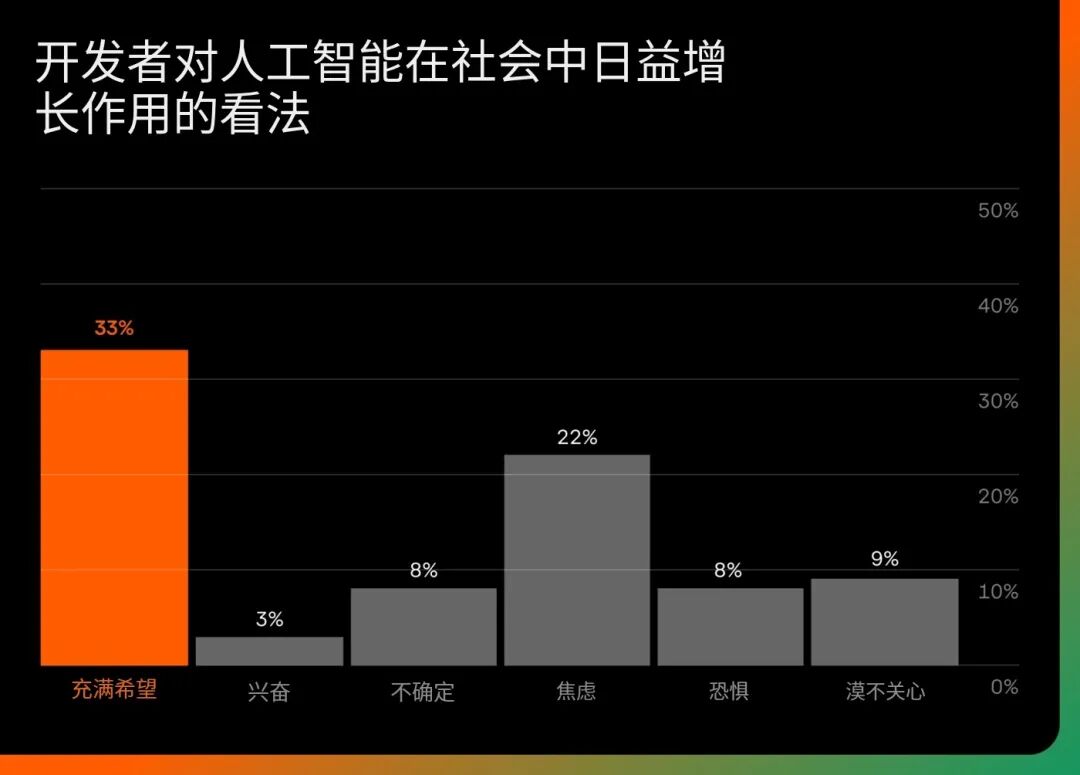Rust 开发者对 AI 的态度是乐观与谨慎并存。三分之一的受访者称,他们对 AI 在社会中日益增长的作用抱有希望,而其他人则表达了不确定性或焦虑。这种平衡反映了一个既重视进步,也深切关心正确性、安全性和长期影响的社区。
