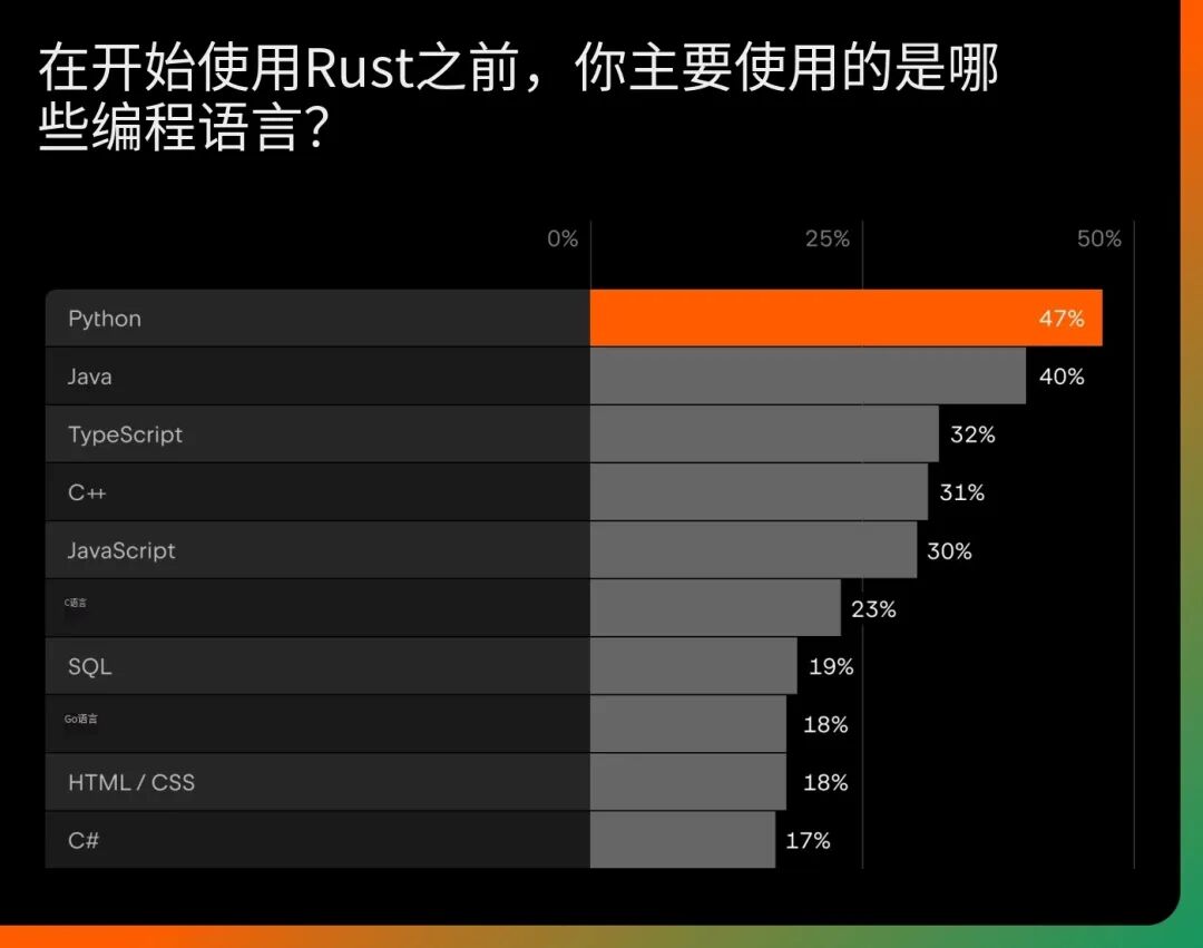 许多采用 Rust 的开发者来自广泛使用的语言,如 Python、Java、TypeScript、C++ 和JavaScript。这种多样性有助于解释为什么 Rust 会出现在如此多不同的应用场景中。Web 开发者、后端工程师和系统程序员都带来了各自的期望和用例,推动着生态系统向多个方向同时发展。