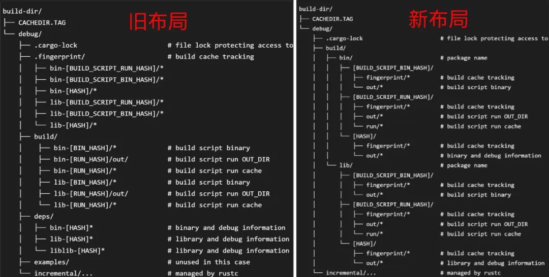 官方博客给出了新旧布局的对比。旧布局下,target/debug/ 里散落着 .fingerprint/、build/、deps/ 等子目录,各种文件按类型堆放。