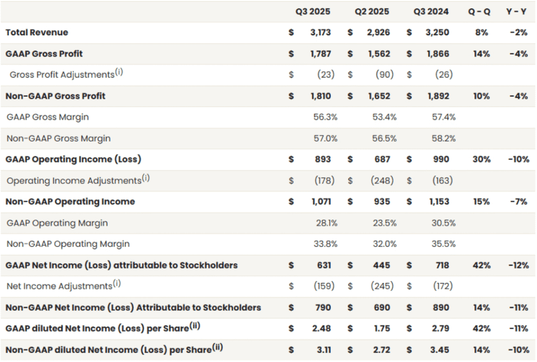 具体来说,恩智浦2025年第三季营收31.7亿美元,虽然同比下滑了2%,但略于市场预期的31.6亿美元;GAAP 毛利率为 56.3%,GAAP 营业利润率为 28.1%,GAAP 稀释每股净收益为2.48 美元;Non-GAAP毛利率为 57.0%,Non-GAAP每股收益3.11美元,符合市场预期。