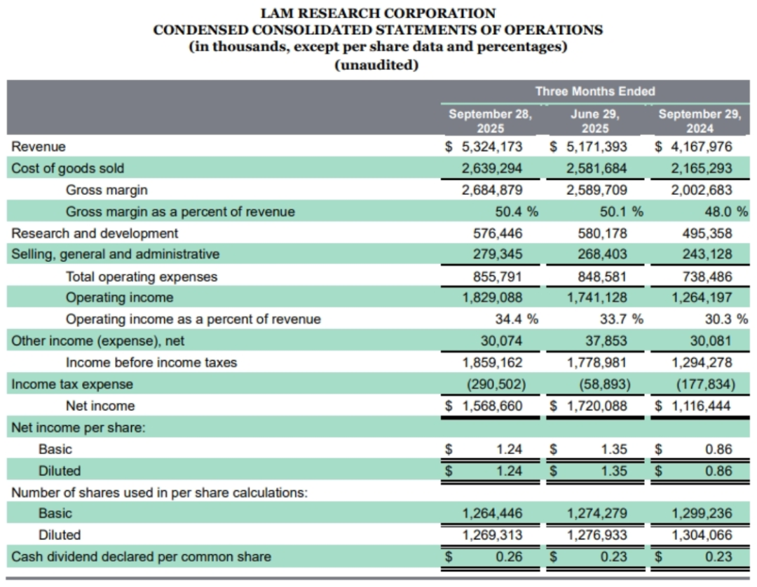 当地时间10月22日美股盘后,美国半导体设备大厂泛林集团(Lam Research)公布了截至2025年9月28日为止的2026会计年度第一财季财报,该季度营收环比增长3%至53.2亿美元,略高于市场预期的52.2亿美元;非依照一般公认会计原则(Non-GAAP)毛利率季增30个基点至50.6%,Non-GAAP 每股收益环比下滑5.3%至1.26美元,高于市场预期的1.22美元。