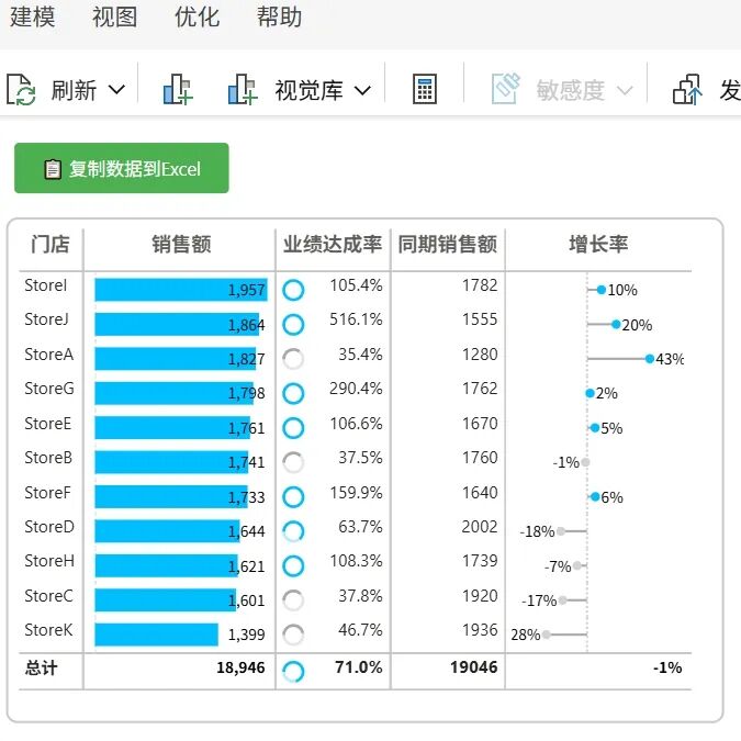 把包含HTML表格、Javascript的完整度量值放入HTML Content视觉对象。与内置视觉对象结合显示,引导用户点击该HTML按钮复制数据,而不是使用...中的导出功能。