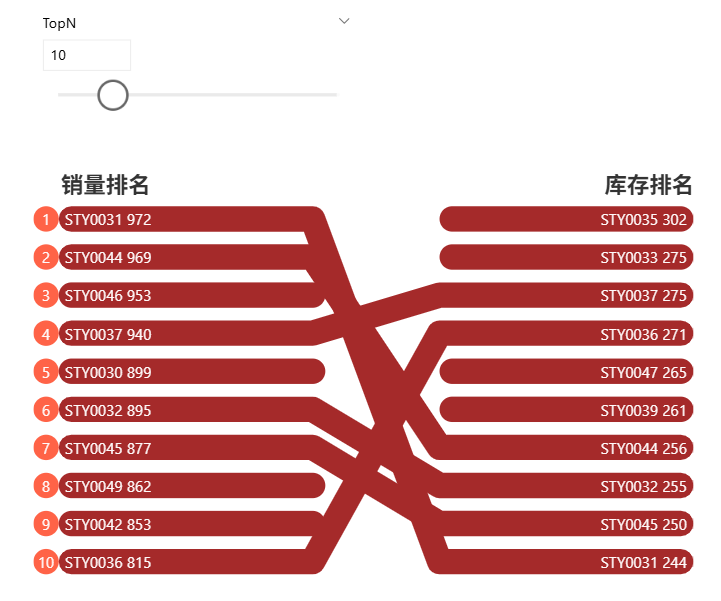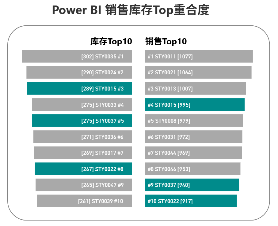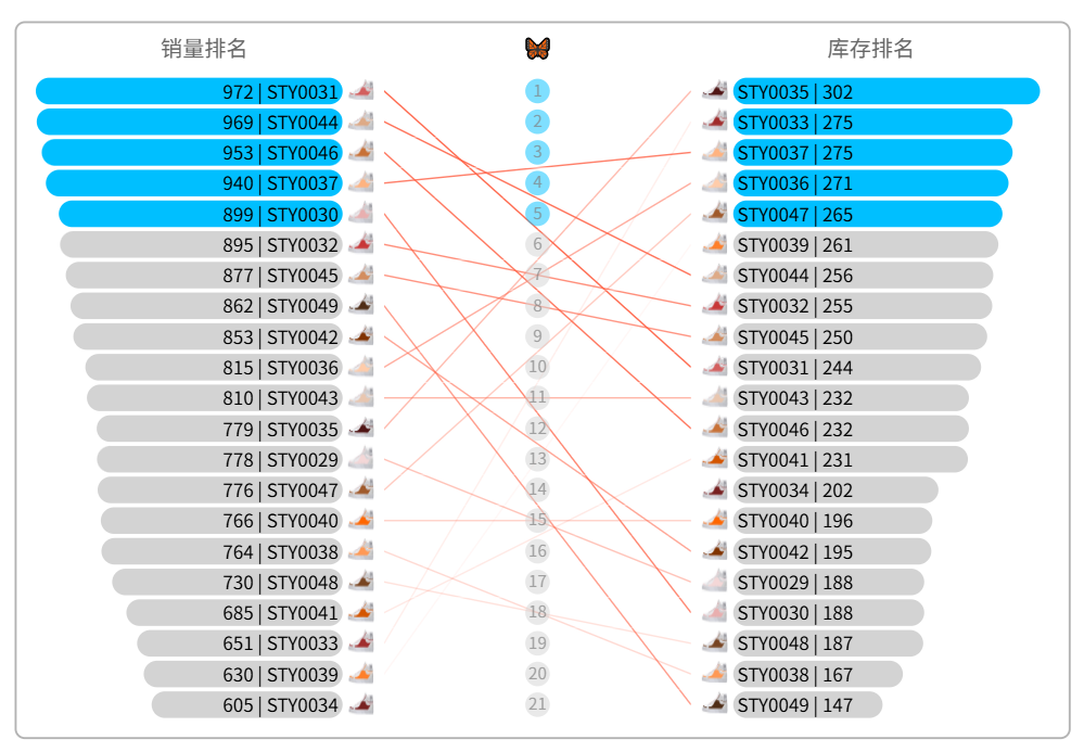 两个对称的条形图组合,可以形成蝴蝶样式,分别展示销售Top和库存Top产品,如果该产品同时在两个Top,则高亮突出。这有利于我们跟进畅销款的补货问题,以及库存款的陈列、销售问题。