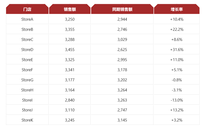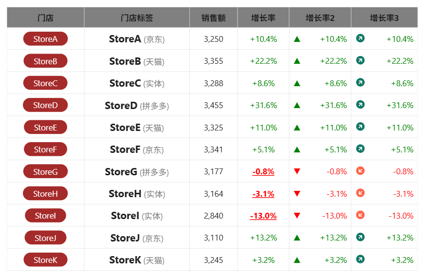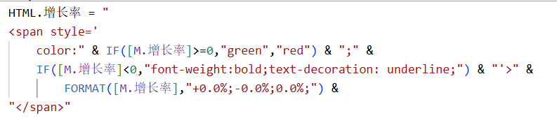 实现这一切需要将列、度量值包裹在HTML中,如下度量值实现了增长率文字颜色、加粗、下划线按数据大小变化: