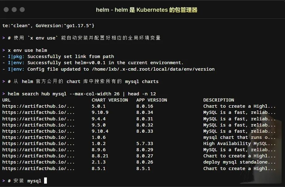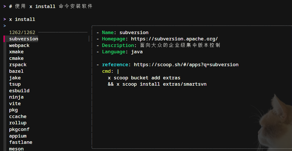 x-cmd 提供了交互式的安装模块 x install,可以帮助用户快速查找并安装所需的软件工具。