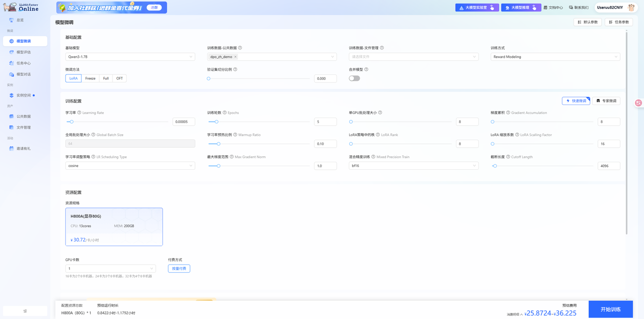 使用已注册的LlamaFactory Online账号登录平台,选择[微调/模型微调]菜单项,进入模型微调配置页面,基模型选择Qwen3-1.7B、数据集选择dpo_zh_demo,训练方式选择Reward Modeling,其余参数配置如下图所示。