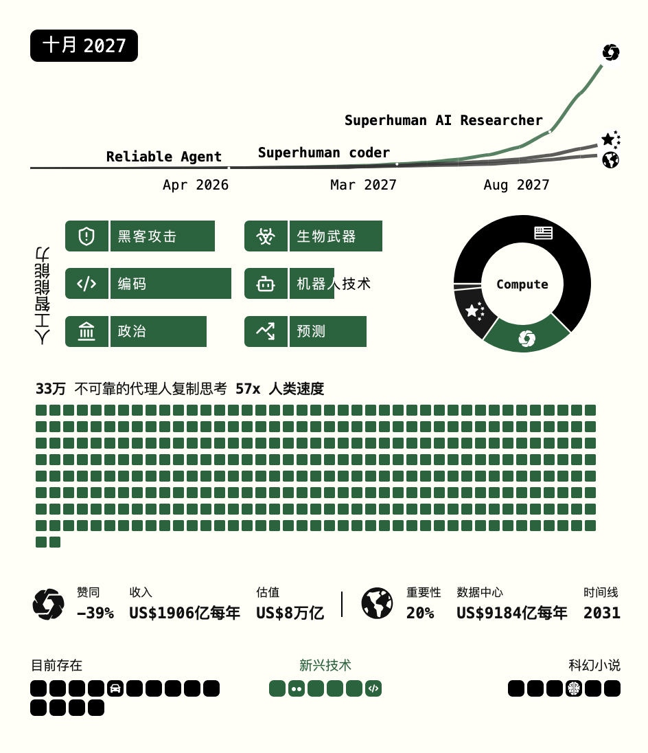 简单来说,它是由前 OpenAI 研究员 Daniel Kokotajlo 领导的、目前业内最权威的 AGI 时间线量化框架之一。