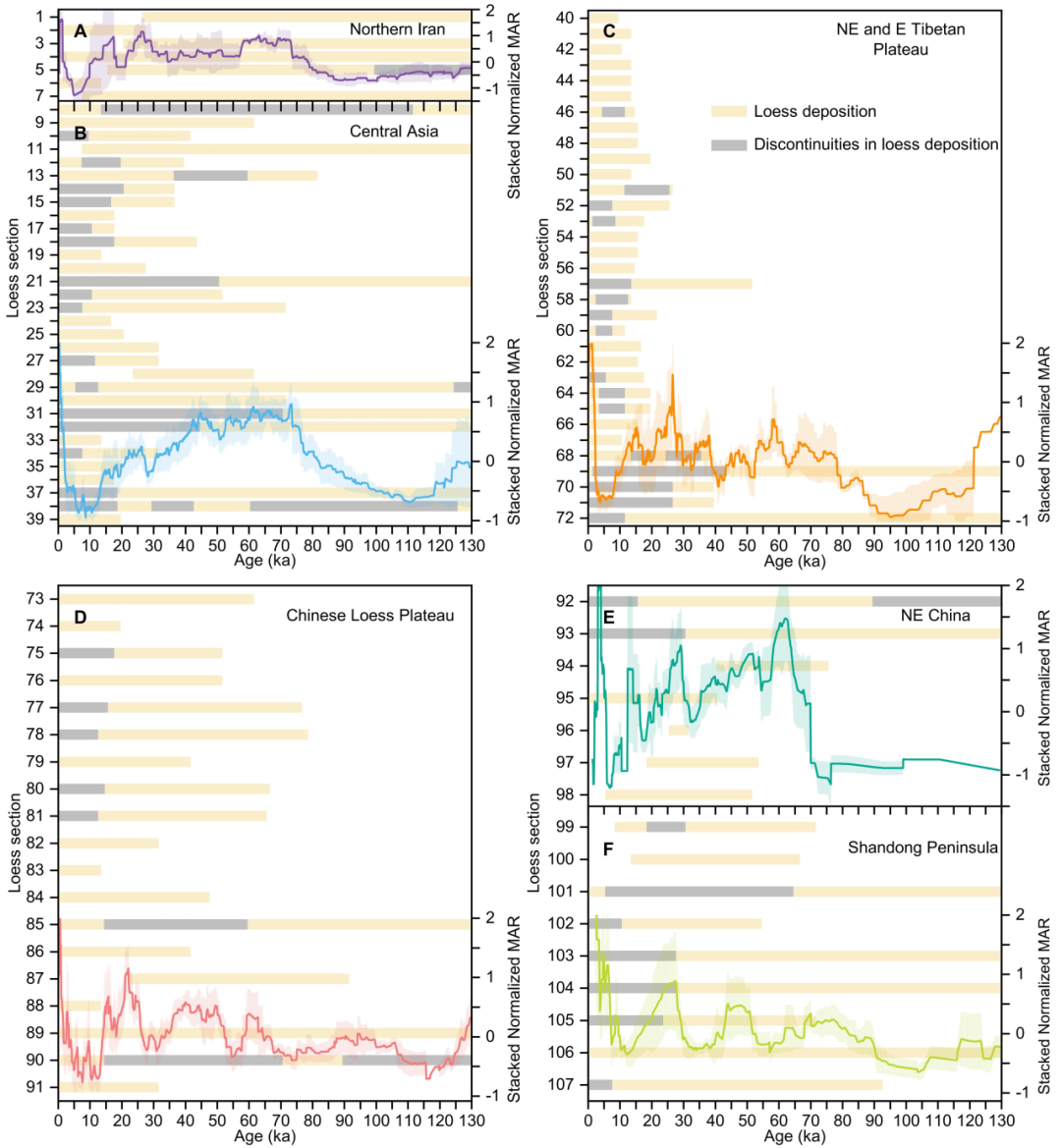 在此基础上,研究团队联合国内外三十余家高校和科研机构的学者,构建并发布了全球首个“亚洲黄土释光测年与古气候代用指标数据集”。该数据集包含了横跨伊朗西北至中国东北地区148条黄土-古土壤剖面的3300个石英和钾长石释光年龄及其原始计算参数,以及3.6万个古气候代用指标数据,为开展亚洲大陆尺度综合研究提供了重要数据基础。基于其中107条具有高分辨率年代标尺的黄土—古土壤序列(图1),研究团队重建了伊朗北部、中亚、青藏高原、黄土高原东部和东北部、山东半岛及中国东北六个亚区过去13万年的粉尘堆积速率与有效湿度变化历史,并定量重建了中亚西风降水以及黄土高原和青藏高原季风降水的演化过程。结合PMIP4古气候模拟结果,研究系统揭示了晚第四纪亚洲降水变化的空间分异特征及其驱动机制。