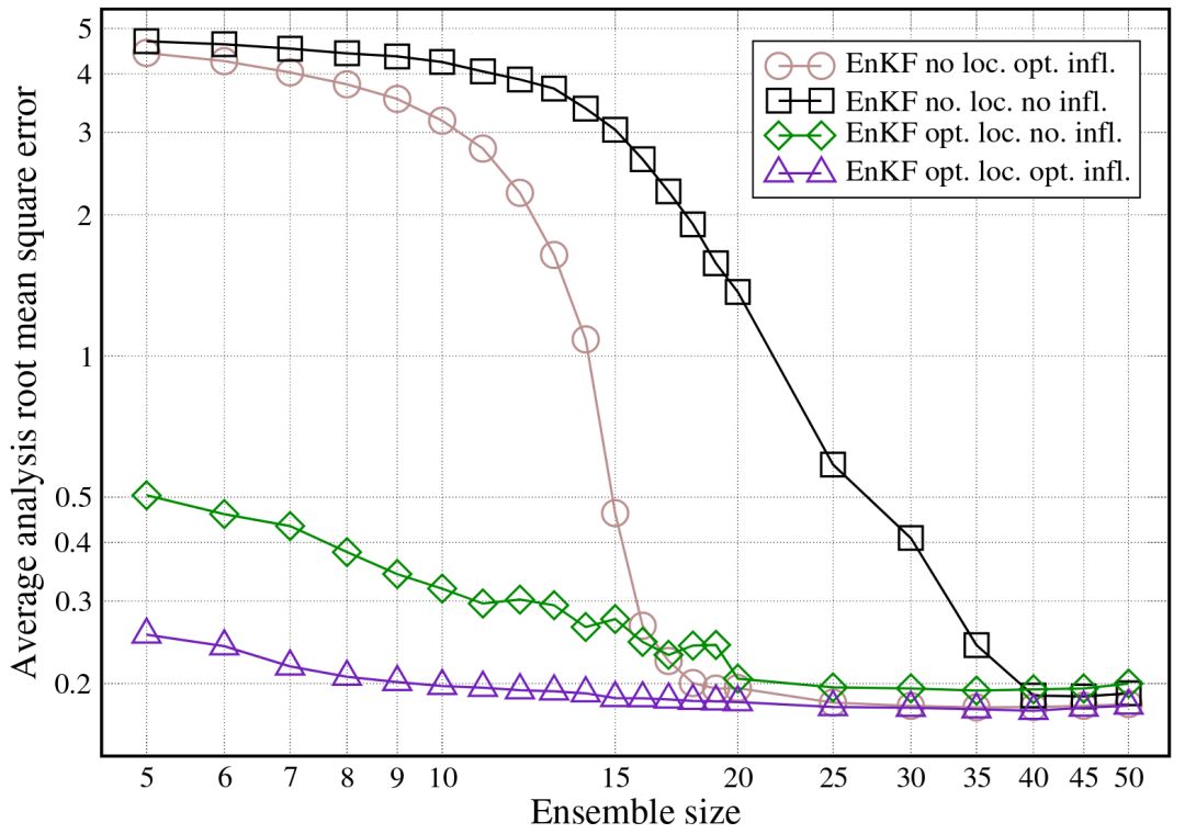 图 3: EnKF 性能分析:局地化与膨胀技术对降低分析误差至关重要(图源:Lecture Notes Rev 0.52, Fig 5.7)