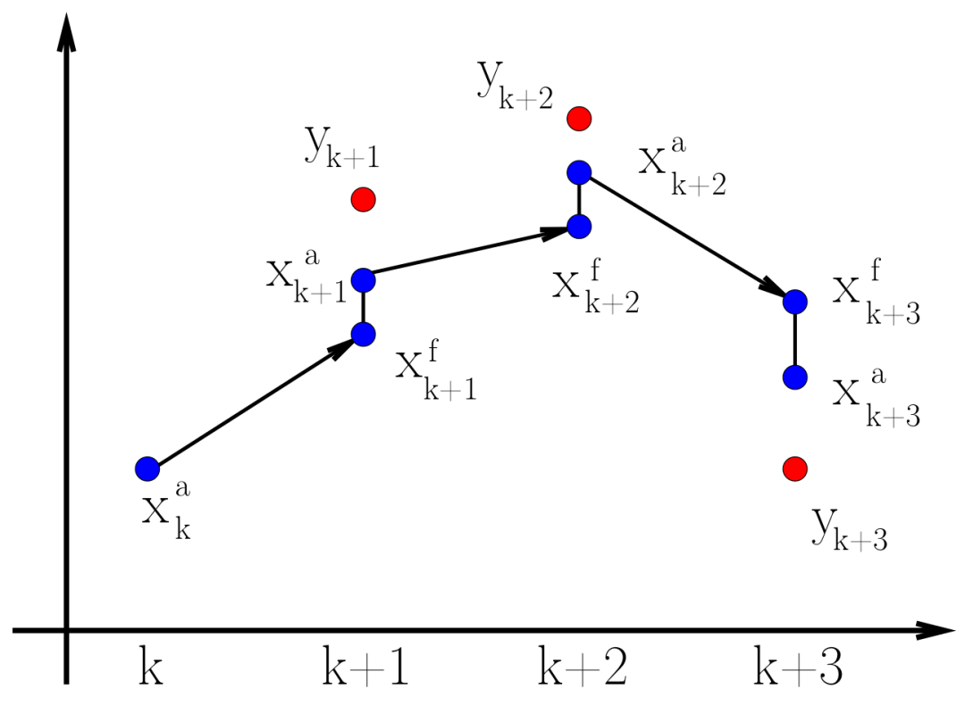 图 2: 4D-Var 同化过程示意图,展示了其与卡尔曼滤波在处理时间维度上的不同(图源:Lecture Notes Rev 0.52, Fig 3.2)