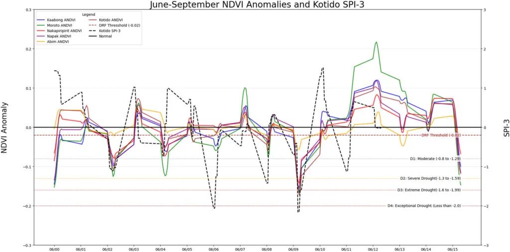 图示为2000年至2015年乌干达卡拉莫贾地区每年生长旺季(6月至9月)期间,卫星观测的归一化植被指数(ANDVI)和标准化降水指数(SPI-3)的异常值。实线代表乌干达六个地区的ANDVI值(左轴),负值表示作物健康状况下降。-0.02 ANDVI的水平虚线代表乌干达政府机构启动财政援助的触发阈值。黑色虚线代表SPI-3的降水异常值(右轴),D1至D4水平线代表SPI-3负值对应的干旱严重程度等级。值得注意的是,当SPI-3指数低于干旱严重程度线(D1-D4)时,六个地区的许多ANDVI值(彩色线条所示)也变为负值,通常低于-0.02的阈值,这表明作物对干旱的反应,预示着潜在的作物歉收,并会主动触发政府的救灾措施。