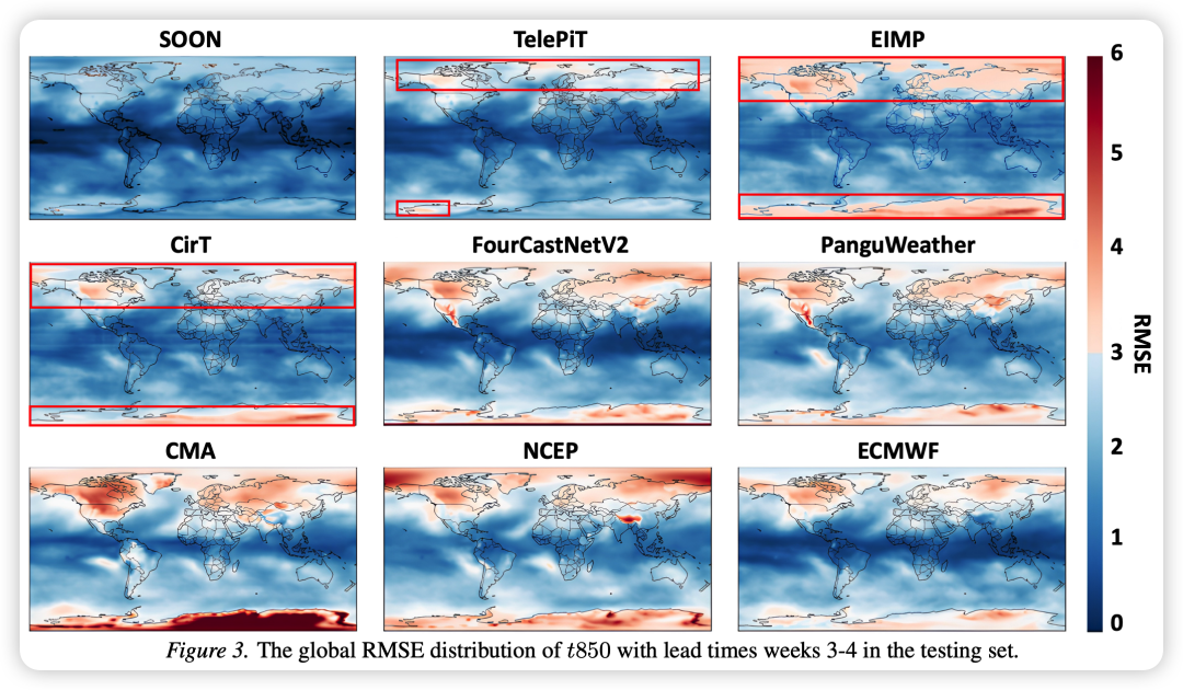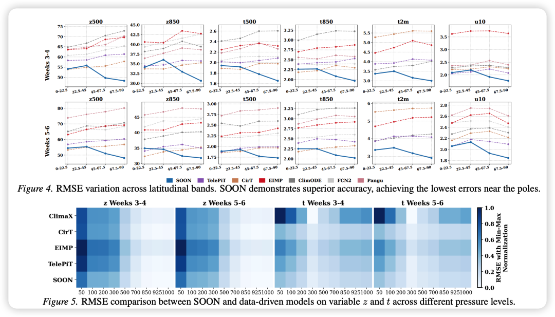 - • 特别是在第5-6周的长时效预测窗口,SOON表现出极强的鲁棒性,而其他模型在此阶段性能大幅下降。