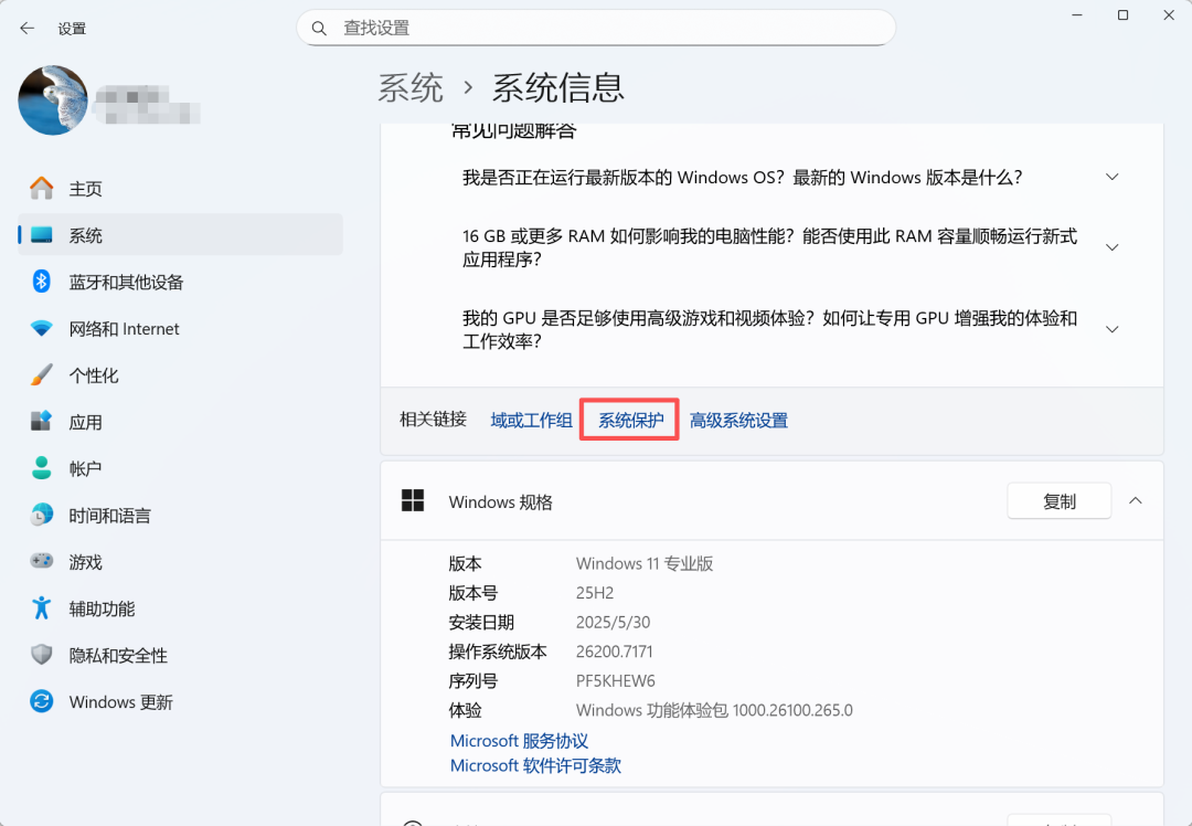 - 依次点击【开始】→【设置】→【系统】→【系统信息】→【系统保护】