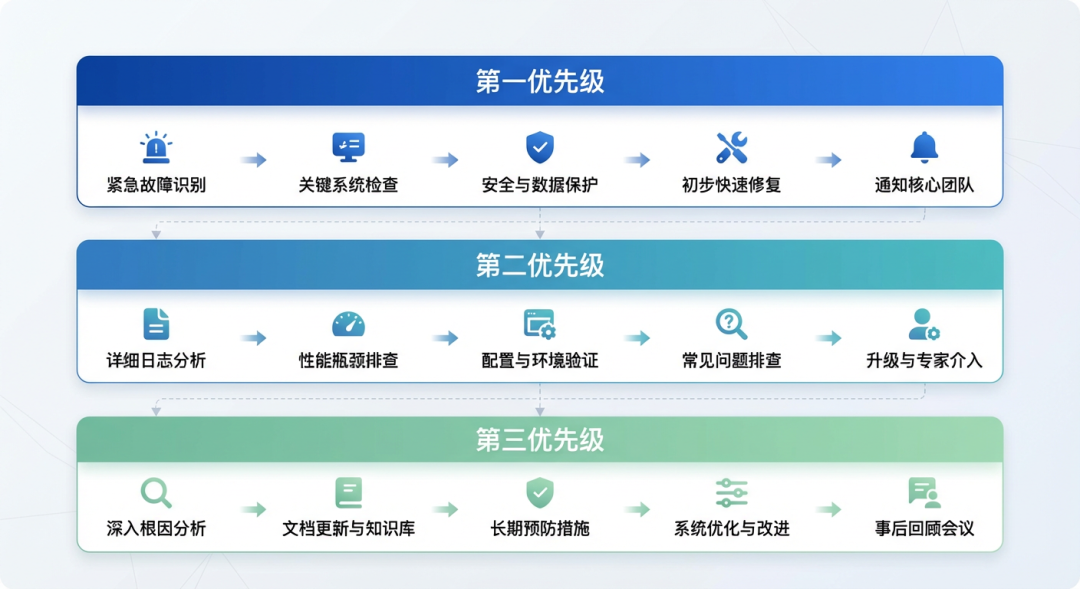 当系统出现问题时,建议按照以下优先级顺序进行排查: