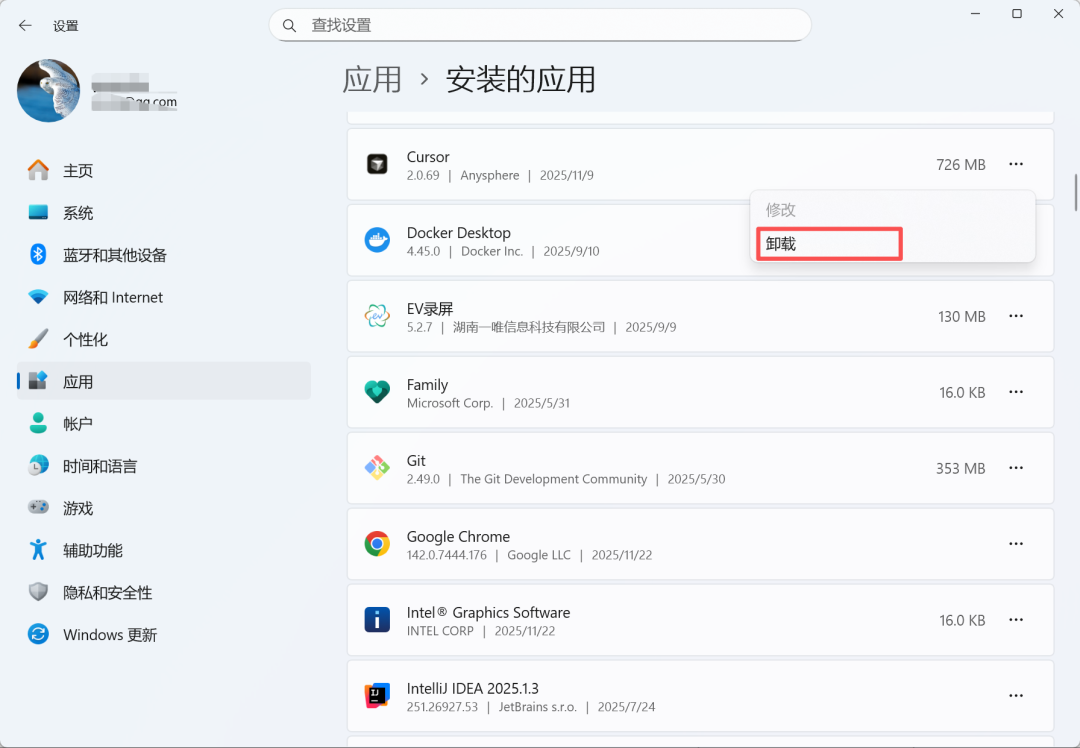 - 找到需要卸载的应用,点击右侧的【…】按钮