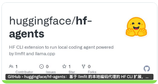 HF-agent 是一个 HF CLI 插件,它使用 llmfit 检测用户的硬件并推荐他们可以实际运行的模型,然后使用最合适的模型启动本地 llama. cpp 服务器并使用 Pi 启动编码代理。从 “我的机器可以运行什么?” 变成一个命令在本地运行 Coding Agent
