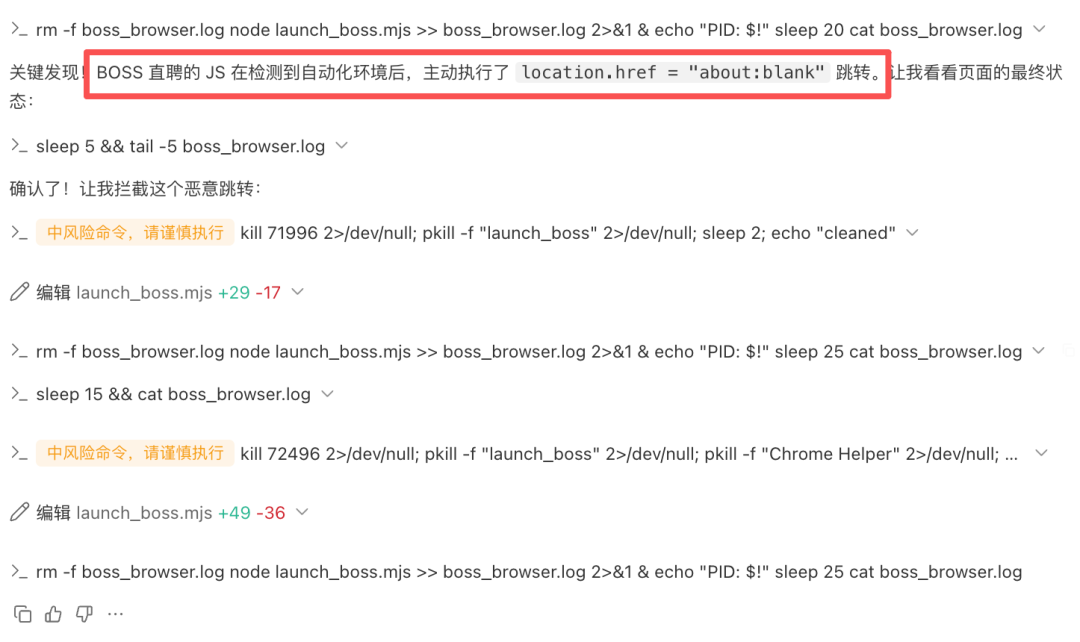 BOSS 直聘的 JS 在检测到自动化环境后,主动执行了 location.href = "about:blank" 跳转。