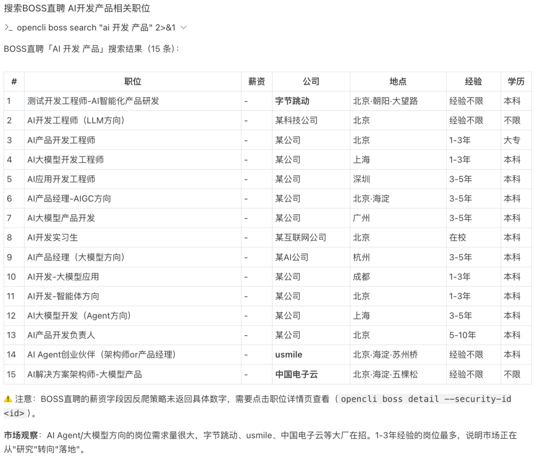 搜索 Boss 直聘上的职位opencli boss search “ai 开发 产品"