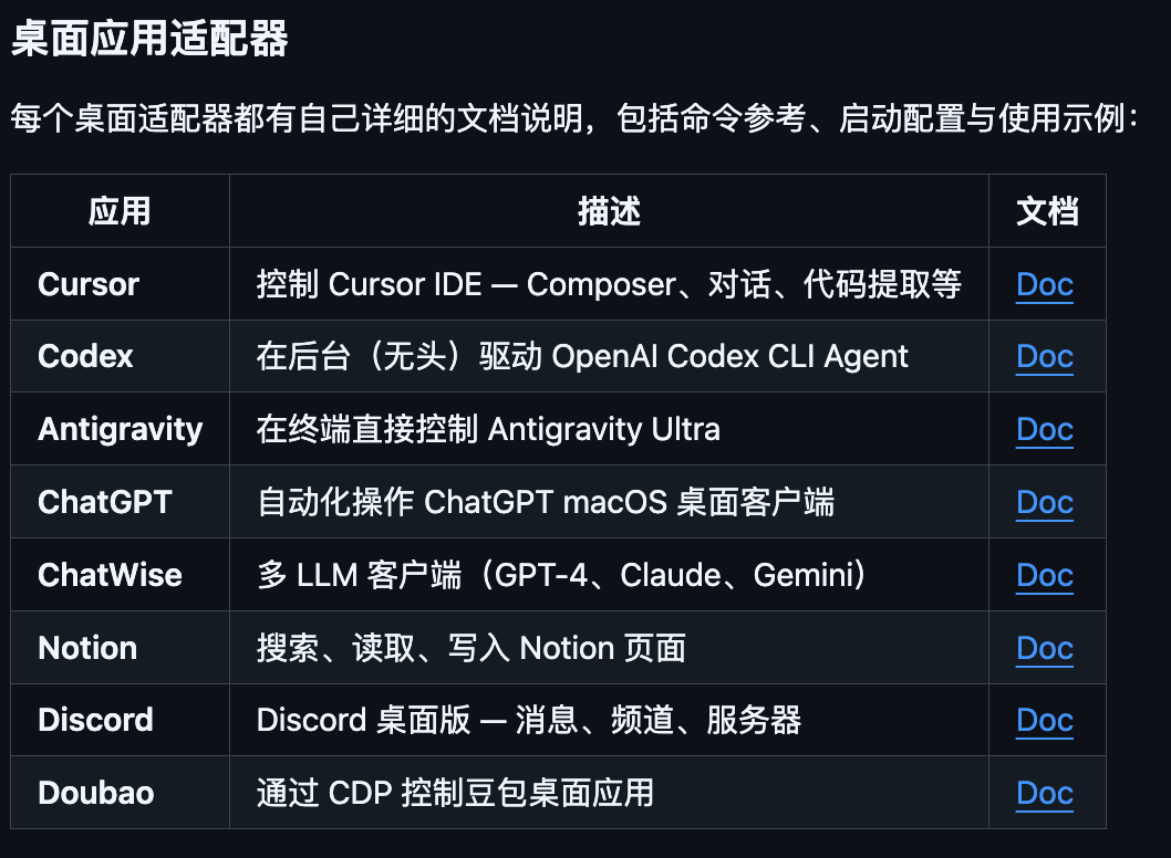 目前流行的 Vibe Code 软件 Cursor,Codex,笔记软件 Notion,社交软件 Discord,还有中国的豆包 doubao,都支持控制。