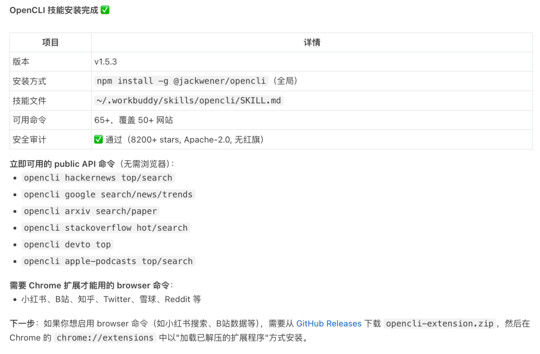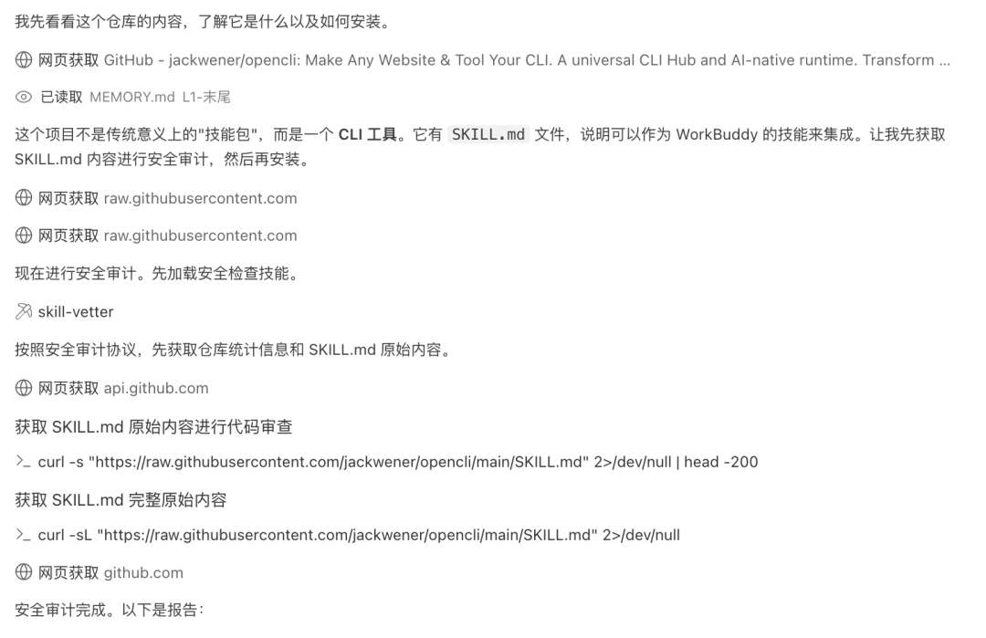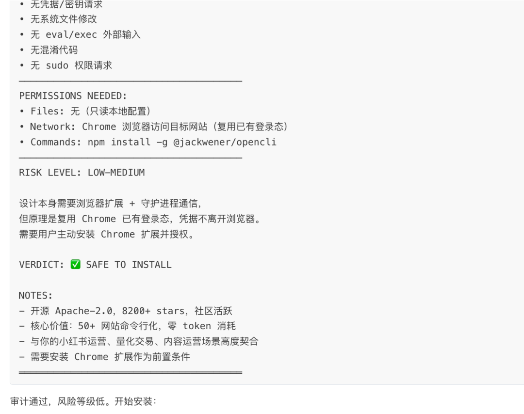 安装这个仓库技能:https://github.com/jackwener/opencli首先经过安全技能skill-vetter的审核