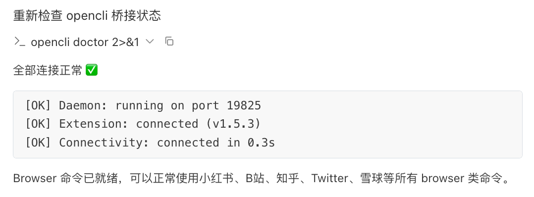 opencli Browser Bridge扩展已经启用,检查桥接状态