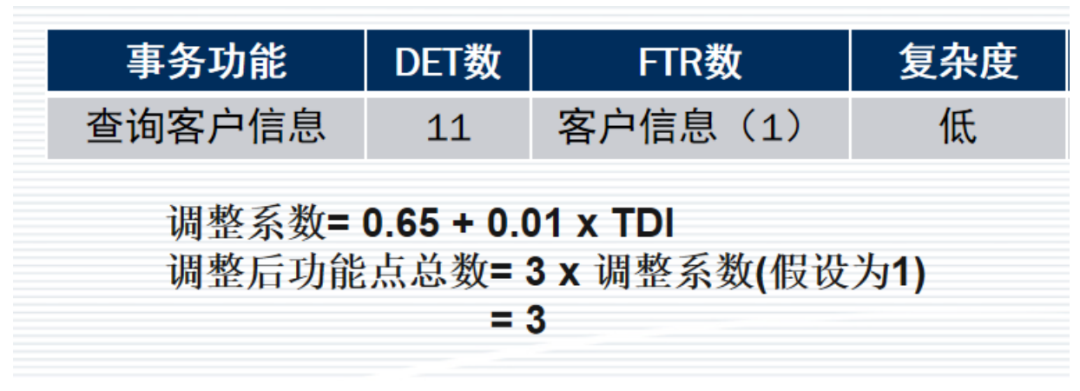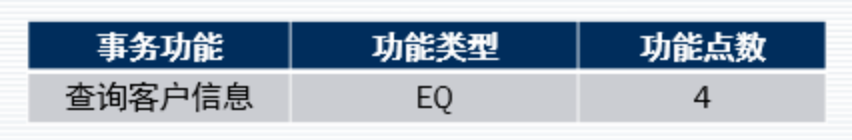 1、 IFPUG度量方法展示查询客户信息属于事务功能EQ,IFPUG需要先进行功能复杂度判断确定功能点个数,确定功能点个数后,需要根据14个因子进行功能点数调整,调整后的功能点数代表度量功能的规模。