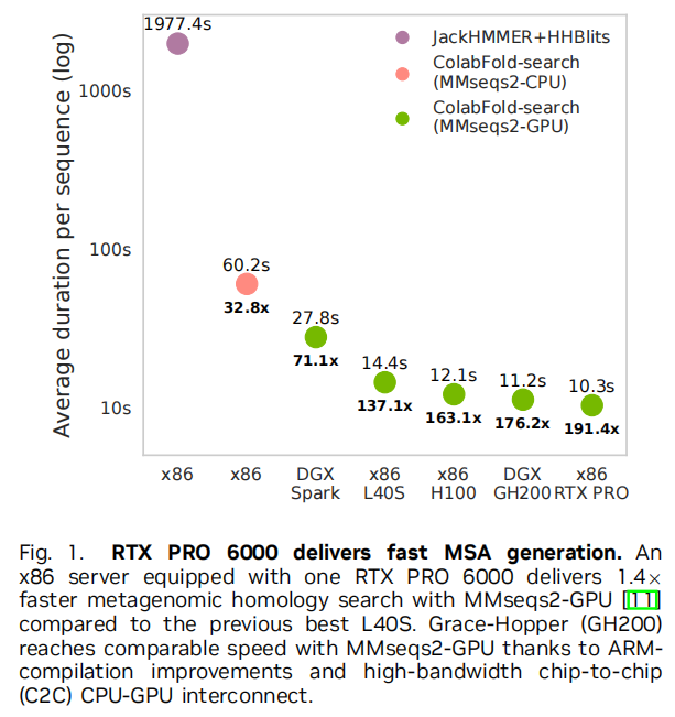 贡献二:MMseqs2-GPU Blackwell优化 利用Blackwell架构的DPX动态规划指令集,将RTX PRO 6000上的MSA生成速度提升至 10.3秒/序列,比L40S快1.4倍,比AlphaFold2原始管线快 191倍。