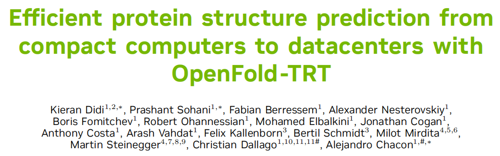论文信息 标题:Efficient protein structure prediction from compact computers to datacenters with OpenFold-TRT 发布:bioRxiv 预印本,2026年3月15日 DOI:10.64898/2026.03.11.711233 作者:Kieran Didi, Prashant Sohani 等(NVIDIA、牛津大学、首尔国立大学等机构)