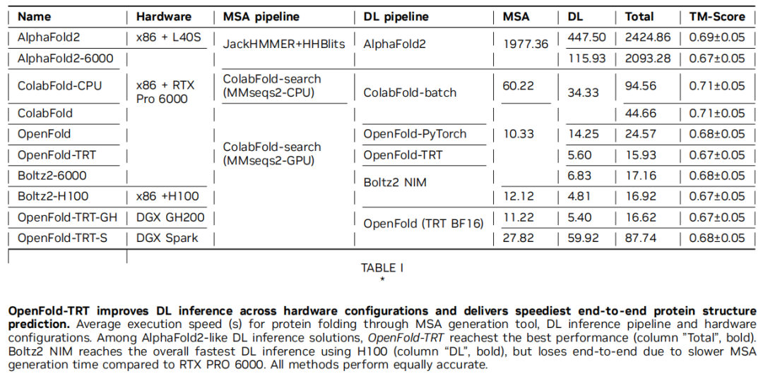 贡献四:跨平台全栈验证 在x86+RTX PRO 6000、DGX GH200、DGX Spark等多种硬件形态上完成端到端验证,最优配置实现 131.4倍端到端加速,同时保持与原版AlphaFold2相当的预测精度(TM-Score)。