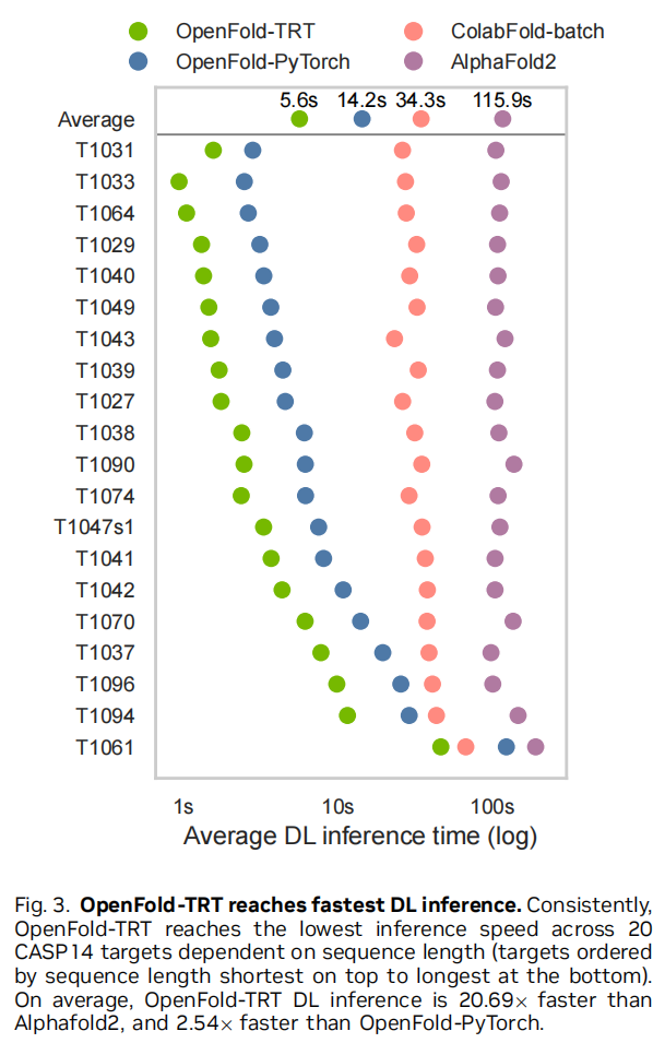 贡献一:OpenFold-TRT 将OpenFold(AlphaFold2的PyTorch开源复现)以TensorRT编译,通过混合精度、动态形状、算子融合三重优化,使DL推理比AlphaFold2原版快 20.69倍,比OpenFold-PyTorch快 2.54倍。