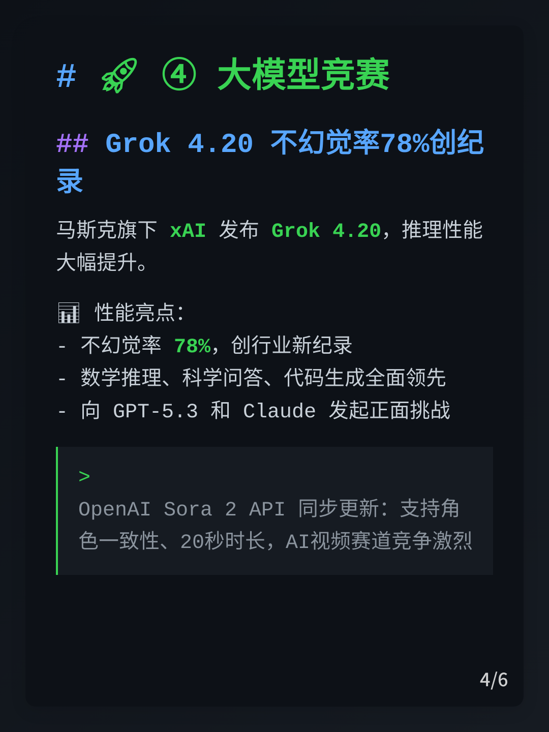 马斯克旗下 xAI 今日正式发布 Grok 4.20 大模型,推理性能显著提升,最引人注目的是其不幻觉率达到 78%,创下行业新纪录。Grok 4.20 在数学推理、科学问答和代码生成等基准测试上表现亮眼,向 OpenAI GPT-5.3 和 Anthropic Claude 等顶级模型发起挑战。与此同时,OpenAI Sora 2 API 也推出重大更新,支持角色一致性、20 秒视频时长与横竖屏双输出,AI 视频生成赛道竞争日趋激烈。