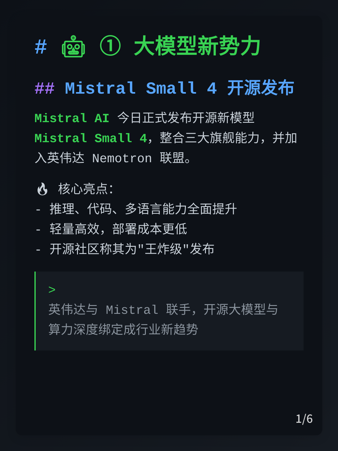 Mistral AI 今日正式发布开源新模型 Mistral Small 4,整合三大旗舰能力,并加入英伟达 Nemotron 联盟。该模型在保持轻量高效的同时,推理、代码生成和多语言处理能力全面提升,被社区称为“开源界王炸”。支持更低的部署成本,为中小企业和开发者提供婲美闭源大模型的能力。英伟达与 Mistral 联手,开源大模型与算力基础设施深度绑定正成行业新趋势。