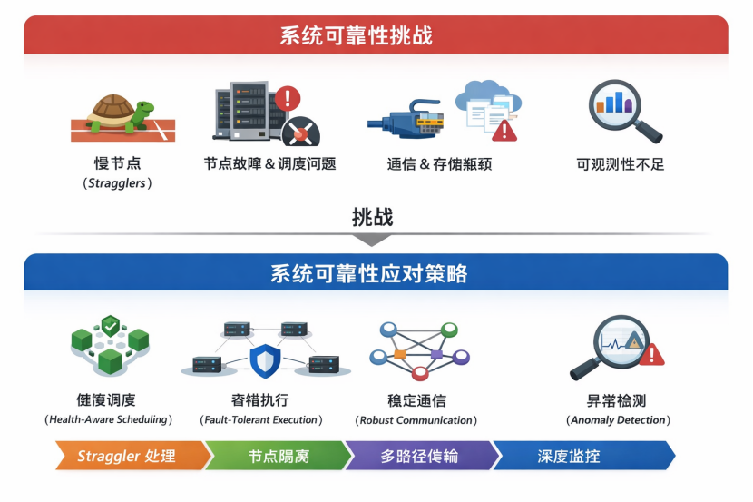 AI系统可靠性需要应对四大核心问题:慢节点、节点故障/调度问题、NCCL等通信问题以及存储IO瓶颈、可观测性不足,通过“检测—隔离—容错—优化通信”四大机制,防止局部问题演化为全局系统失效。
