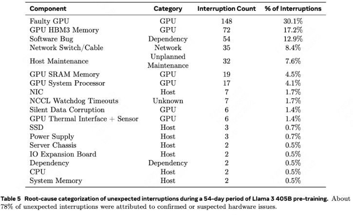 以Meta在Llama 3 405B模型预训练中的经验为例,在一个由16,384块GPU组成的集群中,54天训练期间共发生419次意外中断,平均每约3小时即出现一次故障,其中约78%的中断可归因于已确认或疑似的硬件问题,而其中由GPU及其HBM导致的约占58.7%。