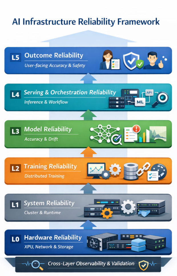 在这一框架下,可靠性工程需要引入跨层观测与验证机制,将硬件遥测、系统指标、训练信号、模型评估以及用户反馈统一纳入同一闭环控制体系,实现从异常检测、根因定位到自动修复与持续验证的全链路能力。