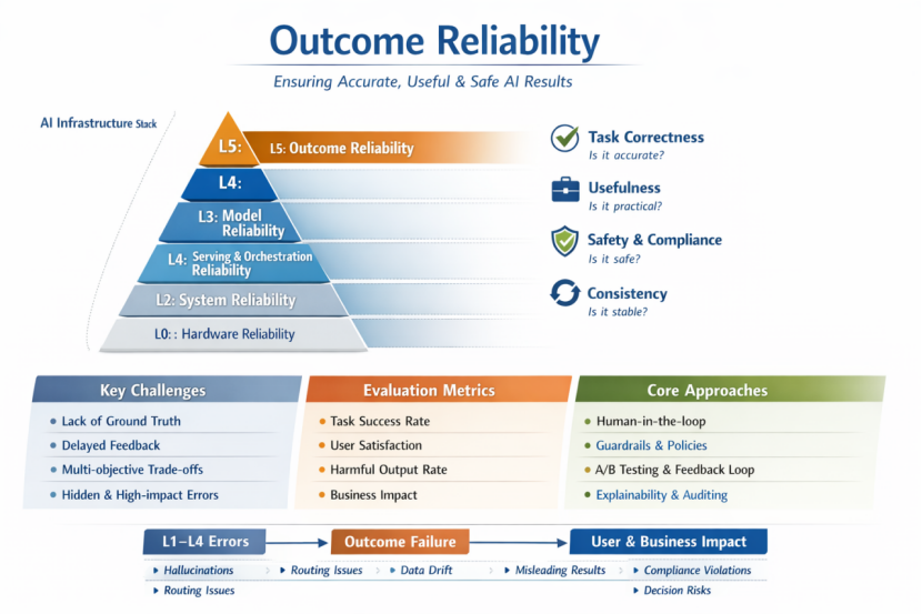 与底层硬件、系统或模型可靠性不同,结果可靠性关注的不是“系统是否运行”或“模型是否正确”,而是用户是否获得了正确、可用、可信且安全的结果。因此,该层本质上是一个以用户与业务为中心的语义与决策层可靠性问题。