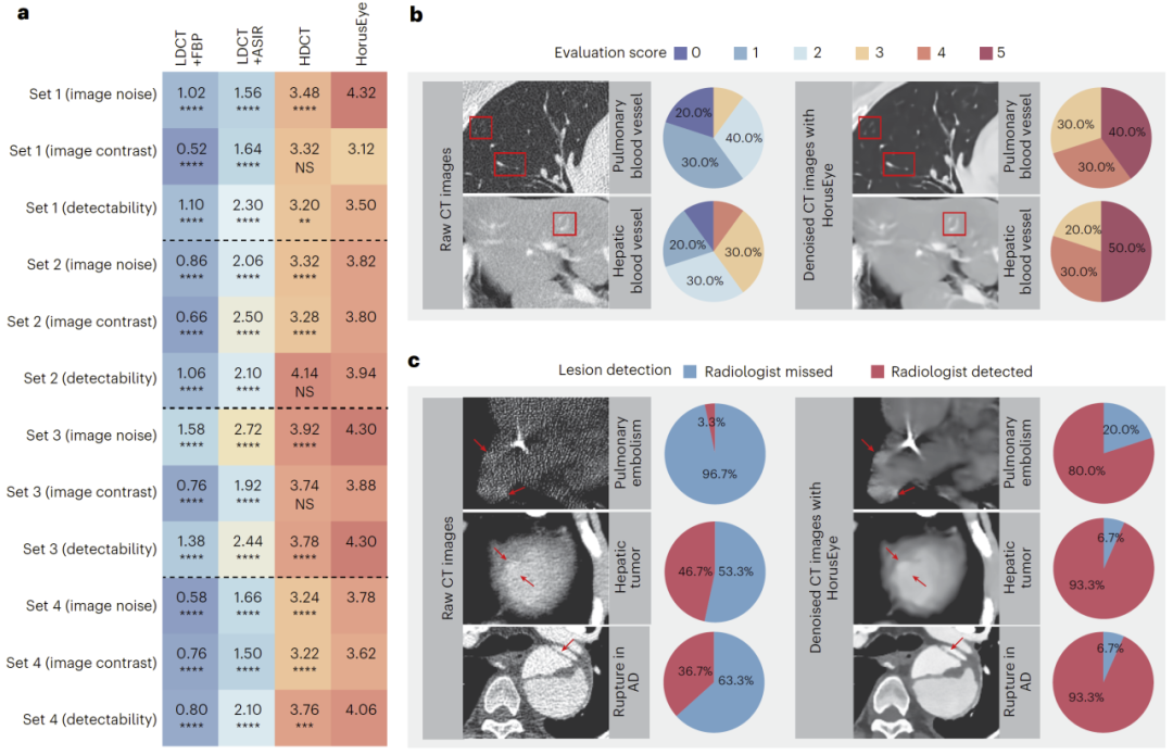在多中心临床评估中,放射科医生对HorusEye处理后的图像评分显著提高,尤其在噪声、对比度和病灶可见性方面均优于原始低剂量图像,并接近高剂量图像水平。