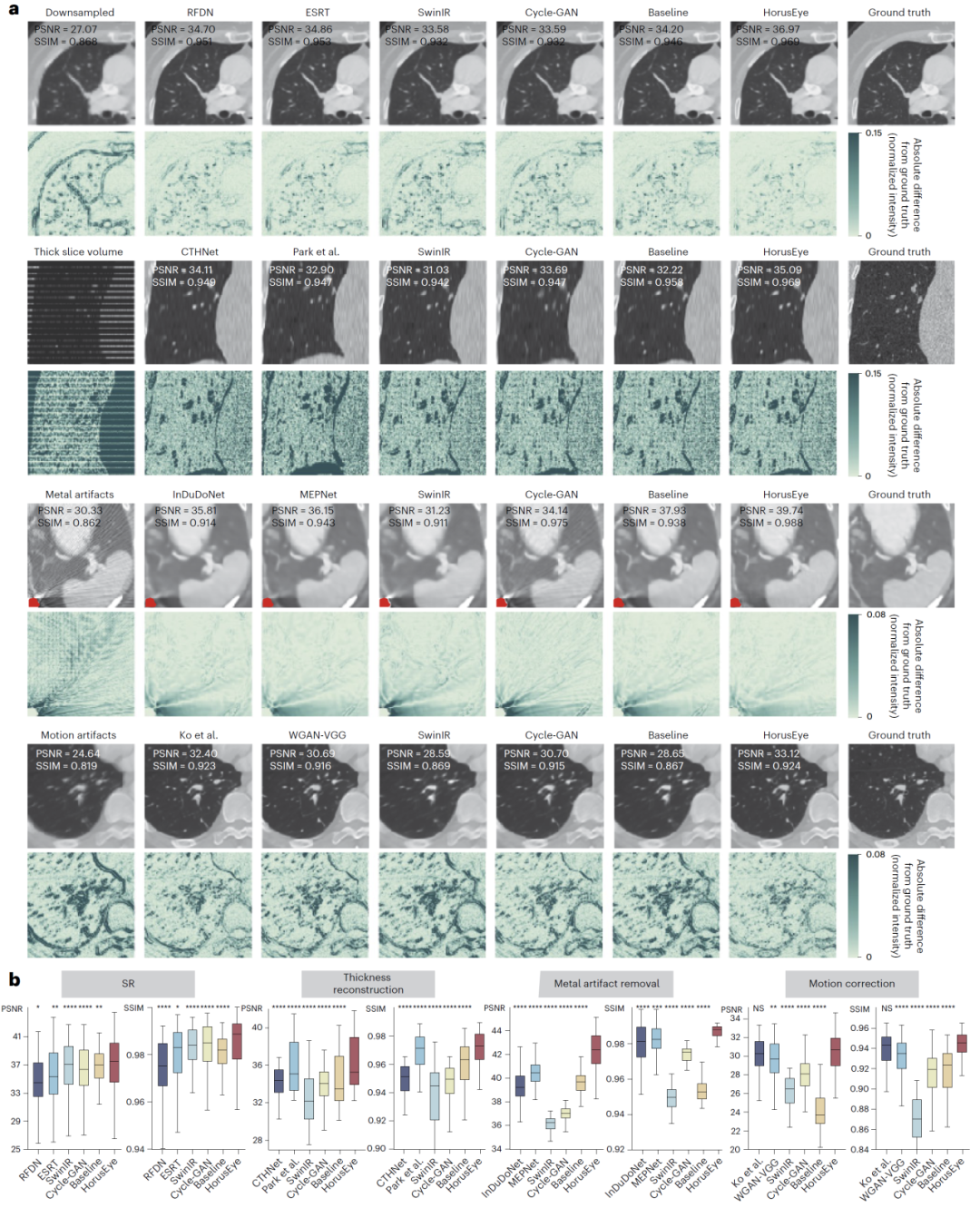 研究将HorusEye应用于多个典型恢复任务,包括超分辨率、厚度重建、金属伪影去除以及运动校正。