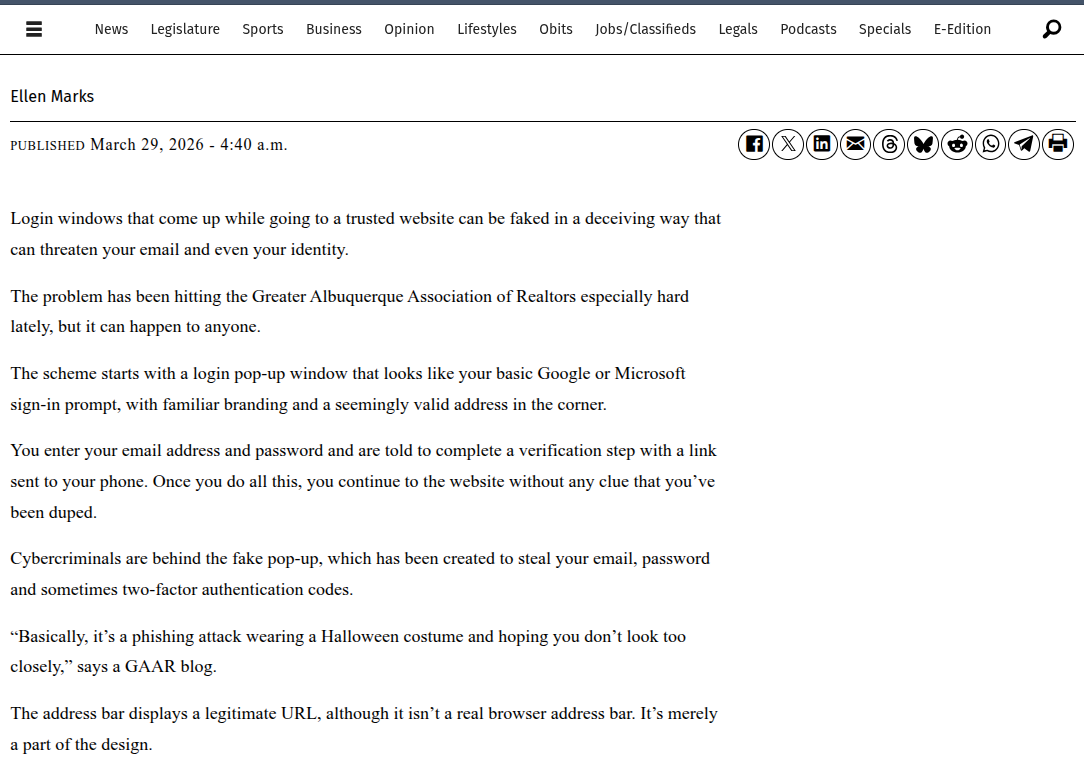 锁定窗口式登录钓鱼是近年来兴起的高仿真网页钓鱼攻击手段,通过伪造不可拖拽、内嵌伪地址栏的登录弹窗,伪装成 Google、Microsoft 等主流平台的合法登录界面,诱导用户输入账号、密码及二次验证信息,实现身份凭证窃取。该攻击在房地产、金融、政企办公等高频登录场景中危害显著,已对北美阿尔伯克基地区房地产行业造成集中影响。本文以真实钓鱼事件为研究样本,剖析锁定窗口钓鱼的前端实现机理、交互欺骗特征与社会工程学诱导逻辑,结合前端安全检测、身份认证加固、用户行为风控等技术维度,构建覆盖检测、预警、阻断、溯源的全流程防御体系。文中给出可落地的前端检测代码与服务端风控逻辑,为企业与个人抵御此类高仿真钓鱼攻击提供技术参考与实践方案。