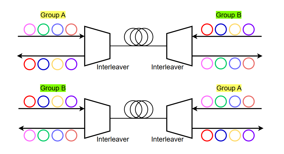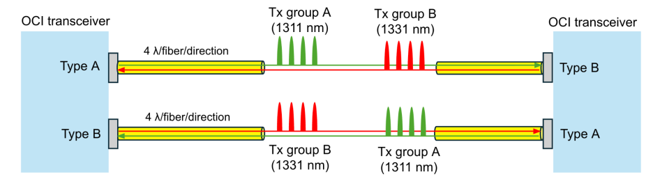 同一个光纤中进行双向光信号(bidirection)的传输,type A对端连接的是type B,如下图所示。每个光引擎包括Type A和Type B这两种类型的端口。Type A发送编码在group A四个DWDM波长的光信号,传递到对端的Type B处,而对端的Type B则发送由group B四个波长编码的光信号,通过同一根光纤,传递到Type A处。