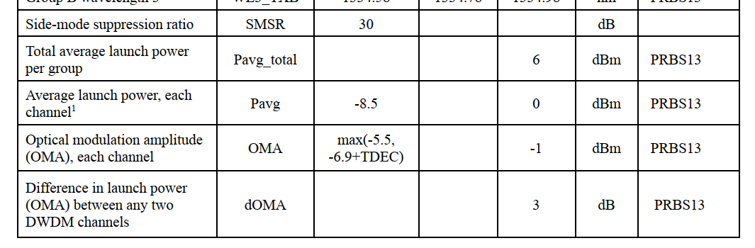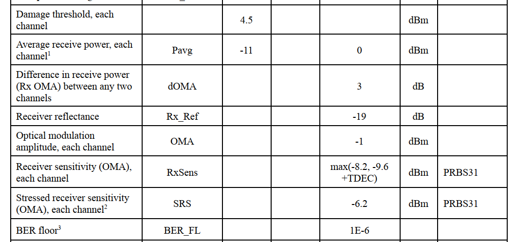 Rx处定义了光功率的范围[-11dBm, 0dBm], BER floor最大为1e-6。