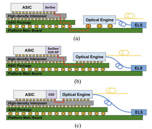 根据光引擎与ASIC的不同集成方式,OCI(计算光互联)的应用场景主要可分为三类,如下图所示,即OBO(on-board optics, OE光引擎通过PCB主板与ASIC芯片互联)、NPO(near-packaged optics,OE光引擎与ASIC芯片封装在同一个基板上)、CPO(co-packaged optics, OE与ASIC芯片封装在同一个interposer上)。伴随着ASIC与OE之间的连接距离缩短,能耗也相应降低。三种方案中都采用外置的激光器模块(ELS, external laser source)。