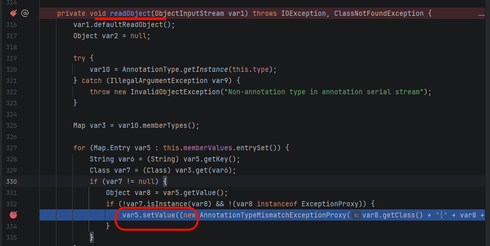 最终找到的是 AnnotationInvocationHandler.class 里的 readObject 方法——这就是我们想要的终点,readObject 会被反序列化自动调用,setValue 在其 for 循环里: