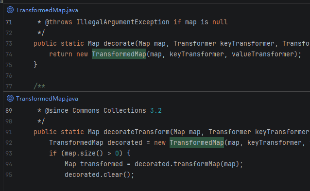 TransformedMap——当 Map 的值被修改时,会自动调用 valueTransformer.transform()。不过它是 protected 类型,不能直接使用,需要找到调用这个方法的入口。
