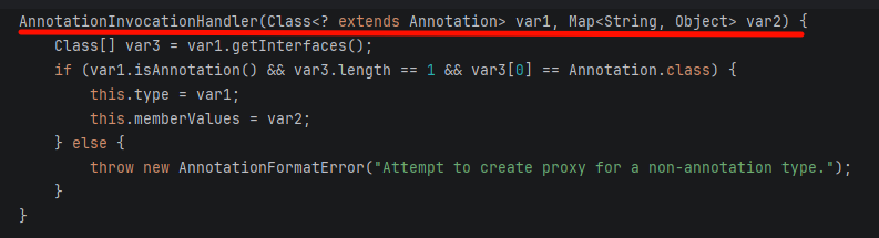 先找到 AnnotationInvocationHandler 的构造方法,看它需要什么参数: