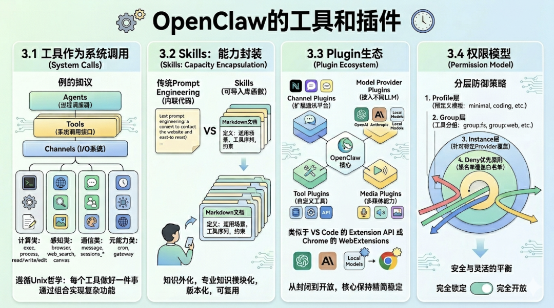 OpenClaw 引入了 Skills(技能)这一概念,它是介于工具和 Agent 之间的抽象层。一个 Skill 是一个 Markdown文档,定义了适用场景(When)、工具调用序列(How)以及约束与边界(Constraints)。