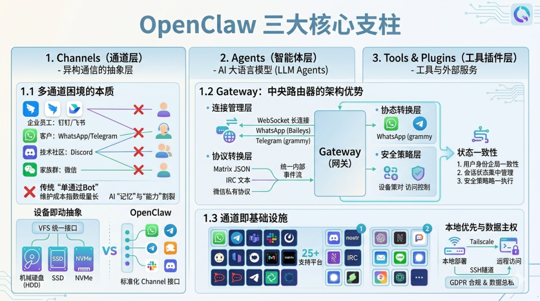 今天这篇文章,我们将从技术架构的角度,深入拆解 OpenClaw 的三大核心支柱:Channels(通道层)、Agents(智能体层)与 Tools & Plugins(工具插件层),并聊聊这种设计背后蕴藏的工程智慧。(OpenClaw 的整体架构总览参见之前的文章:现象级开源AI智能体:OpenClaw 架构深度解析)