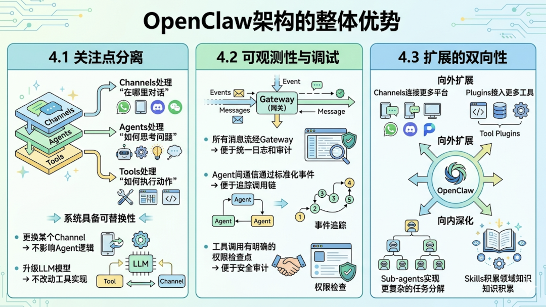 将 Channels、Agents、Tools 三层结合起来,OpenClaw 展现出独特架构优势: